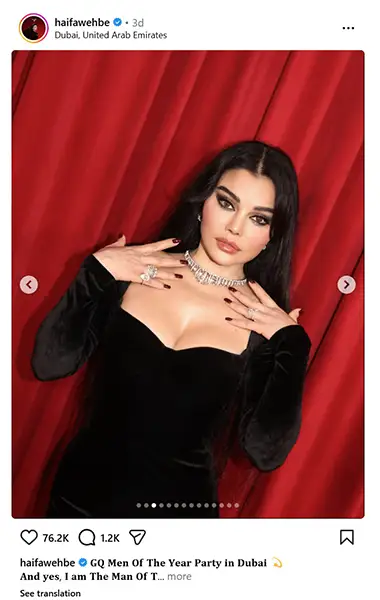 أضيفي إلى ذلك مجوهرات من Sartoro Genève، تلك القطع اللامعة التي تضيف لمسة سويسرية فاخرة، وستفهمون لماذا حصد المنشور أكثر من 76 ألف إعجاب في أيام قليلة. هيفاء تثبت مرة أخرى: الأناقة ليست في الكم، بل في الجرأة.