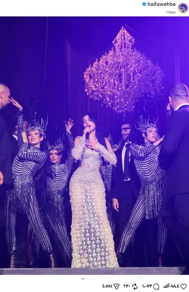 “فستان هيفاء وهبي في رأس السنة بأبو ظبي: ديسكو بول يضيء المسرح.. وتقصير الفستان بلمح البصر يثير جنون الجمهور!”