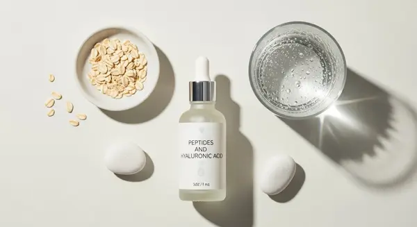 - الببتيدات (Peptides): تقوي الحاجز الجلدي، تحسن المرونة، وتعزز إنتاج الكولاجين بشكل لطيف. مناسبة جداً لمن لا يريد “ثورة تقشير” بل “حياة يومية هادئة” لبشرته.